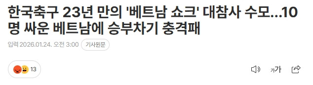 {jz:field.toptypename/}韩媒文章标题:韩国足球时隔23年遭遇“越南冲击”耻辱惨败……对阵10人作战的越南在点球大战中震惊落败。