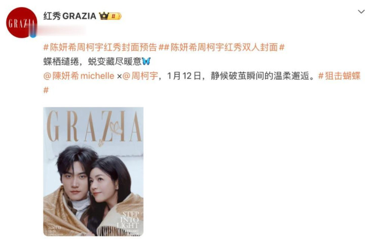 陈妍希、周柯宇主演的姐弟恋爱情剧《狙击蝴蝶》大受欢迎,创下 5 亿播放量外,更在豆瓣开出 7 分高分,成为年度爆款现偶剧之一。 《狙击蝴蝶》播出大结局后,陈妍希、周柯宇今天穿情侣装惊喜登时尚杂志《红秀 GRAZIA》中文版的开年刊封面,两人在镜头前靠头依偎、牵手,缱绻秀爱不停,花絮中更笑场打闹超亲密,引爆 CP 粉沸腾,狂赞是最强售后,杂志开卖 1 小时就狂卖 7500 本。