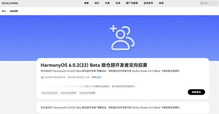需要了解,华为开发者官网公布了鸿蒙HarmonyOS 6.0.2的文档,带来鸿蒙API 22 Beta版本,并且6.0.2 (22) Beta在6.0.1 (21)的基础上,开发能力得到进一步增强。