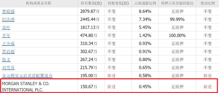 三季度,摩根斯坦利新进150万股,位列第十大流通股东。